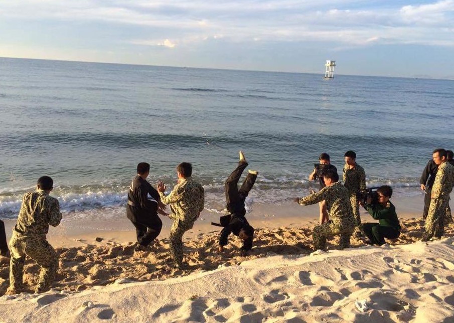 Cảnh làm phim tài liệu Những người giữ biển; đạo diễn NSUT Phạm Huyên. |