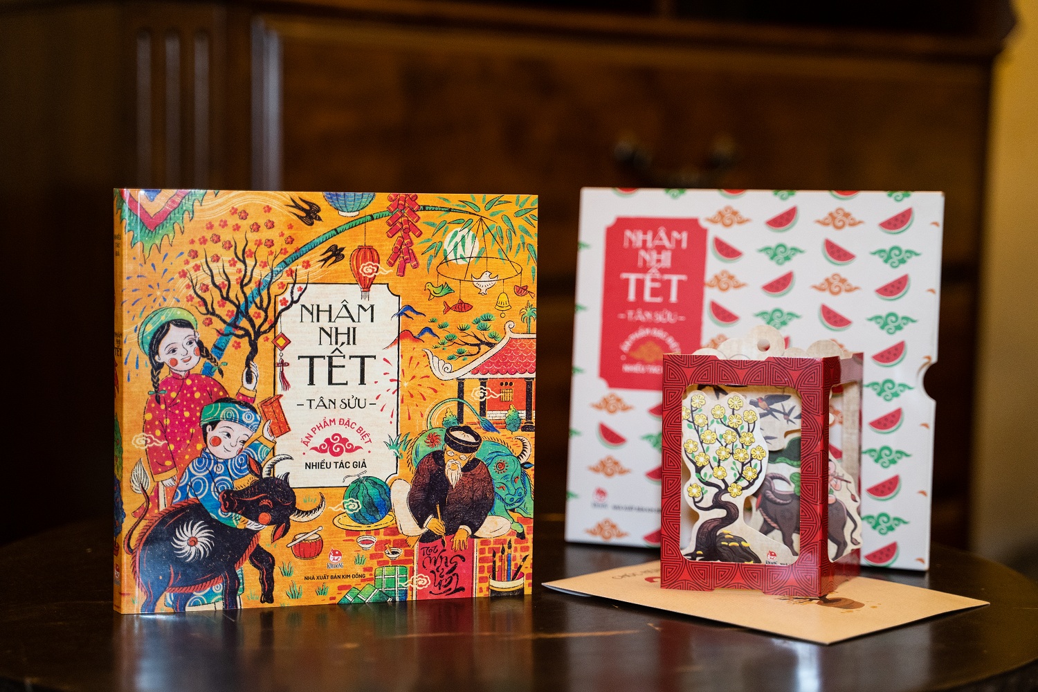 Mỗi cuốn sách Nhâm Nhi Tết – Tân Sửu 2021 được tặng kèm một tấm thiệp Xuân với hình thức pop-up 3D độc đáo - chiếc đèn lồng họa cảnh có thể treo lên cành đào cành mai, cùng mừng xuân mới tươi vui. Cuốn sách được đặt trong một chiếc hộp vuông vức xinh xắn như một món quà năm mới đầy ý nghĩa.