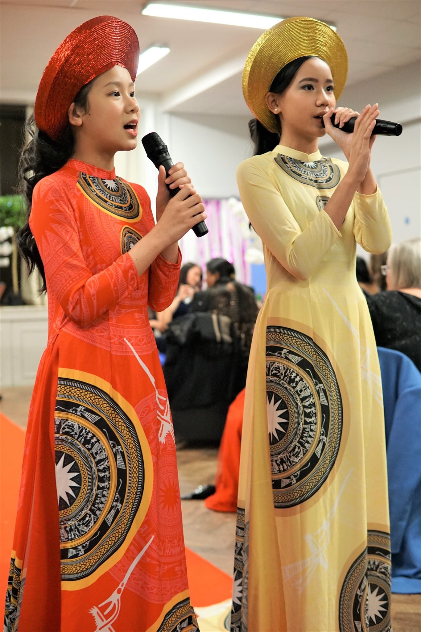 | Emily Nguyễn và Anna Hoàng kết hợp trình diễn catwalk áo dài truyền thống Việt Nam và hát bằng 2 ngôn ngữ Anh - Việt với ca khúc “Em trong mắt tôi. |