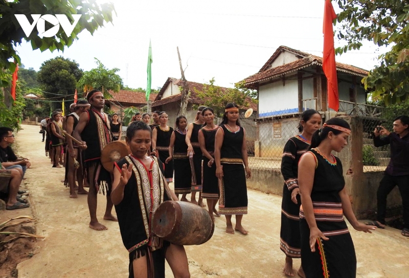 Người dân làng Kon Kơ Tu, xã Đăk Rơ Wa, thành phố Kon Tum sử dụng cồng chiêng và múa xoang trong ngày hội làng - Ảnh: VOV |