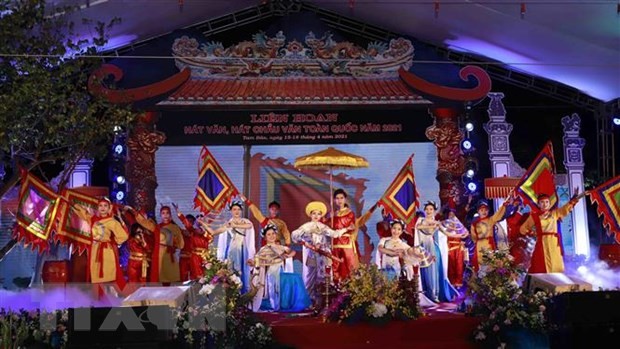 Một tiết mục hát văn của Trung tâm văn hóa Vĩnh Phúc tại Liên hoan hát Văn, hát Chầu Văn toàn quốc năm 2021 - Ảnh: Hoàng Hùng/TTXVN |