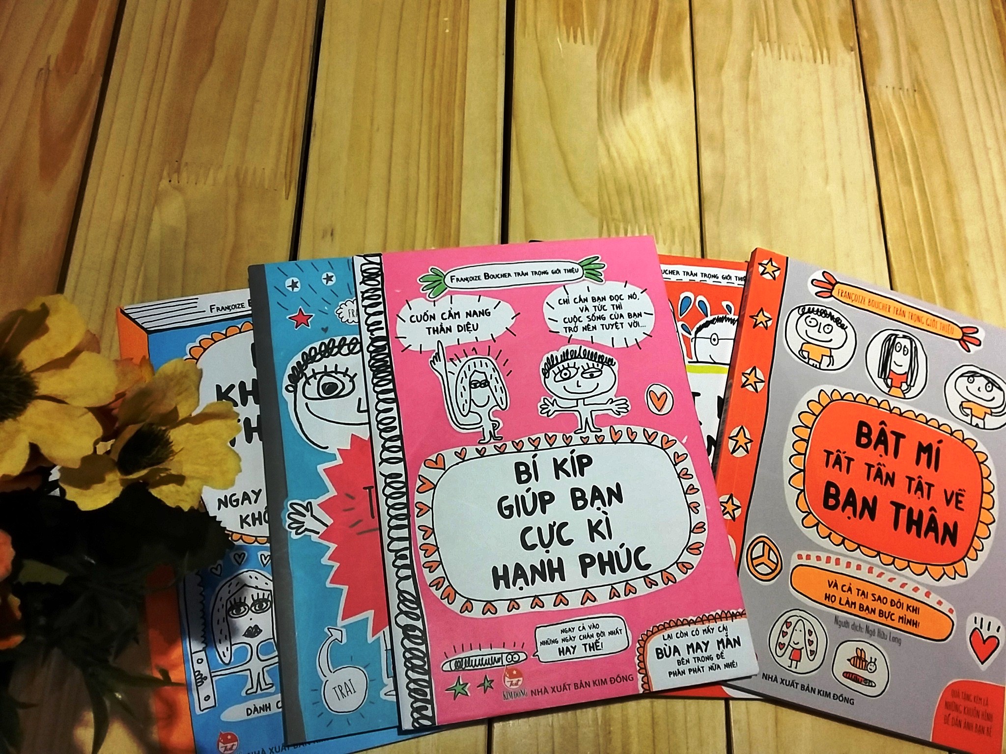 5 cuốn trong sê-ri Bí kíp giúp bạn hạnh phúc của Francoize Boucher không đánh số trang, đính kèm trong mỗi cuốn sách là một tấm postcard ấn tượng, đầy chất sáng tạo.