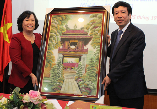 | Lãnh đạo hai đơn vị tặng quà lưu niệm |