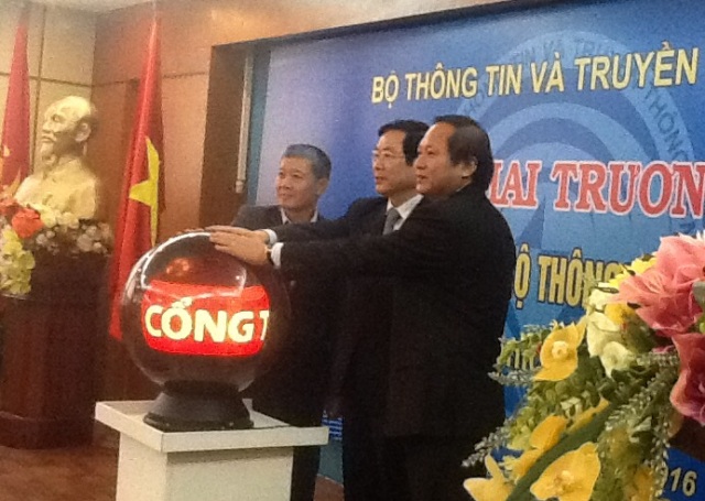 | Ảnh: Lãnh đạo Bộ Thông tin và Truyền thông ấn nút khai trương Cổng thông tin. |