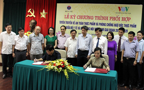 (VOV5) - Ngày 14/6, tại Hà Nội, Bộ trưởng Bộ Y tế Nguyễn Thị Kim Tiến và Tổng Giám đốc Đài Tiếng nói Việt Nam Nguyễn Thế Kỷ ký kết chương trình phối hợp tuyên truyền về an toàn thực phẩm và phòng chống ngộ độc thực phẩm giai đoạn 2016 - 2020.