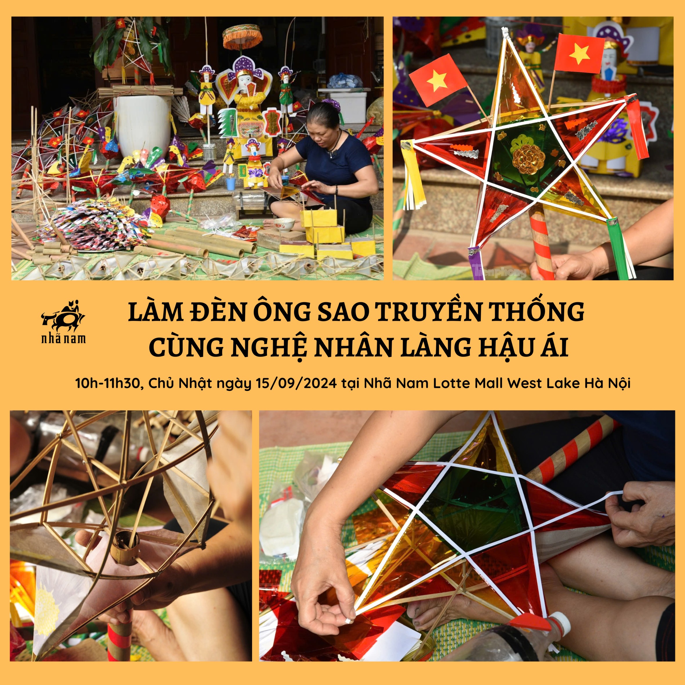 Từ 10h00-11h30 Chủ Nhật, ngày 22/09/2024, tại Nhã Nam Bookstore - Tầng 4, Lotte Mall Tây Hồ (272 Võ Chí Công, Hà Nội), nghệ nhân làng Hậu Ái trực tiếp hướng dẫn khán giả làm đèn ông sao truyền thống từ các nguyên liệu thân thiện với môi trường như giấy, tre nứa.