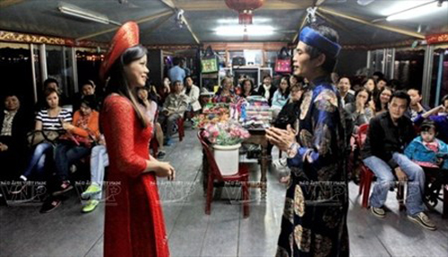 Những câu ca đối đáp trong chương trình biểu diễn ca Huế trên thuyền. (Ảnh: Báo Ảnh Việt Nam/TTXVN)