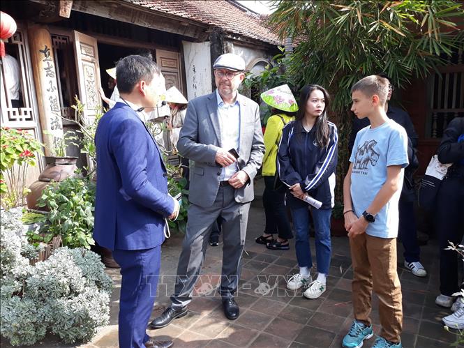 Các đại sứ và khách quốc tế trải nghiệm không khí Tết cổ truyền tại Làng cổ Đường Lâm (Hà Nội) - Ảnh: TTXVN |