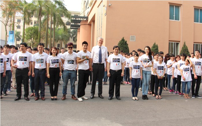500 sinh viên ĐH Công nghiệp Hà Nội cùng các đại sứ và đại diện Bộ Công Thương, lãnh đạo nhà trường thực hiện xếp hình 60+HAUI (tên viết tắt của ĐH Công nghiệp Hà Nội).