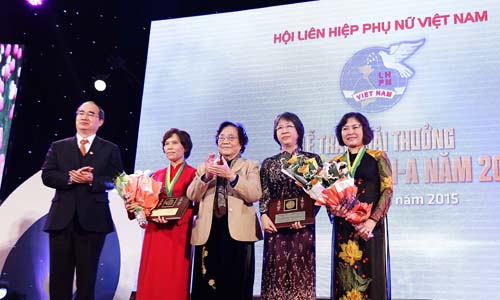 | Phó Giáo sư Nguyễn Thị Bình, trưởng nhóm nghiên cứu, ngoài cùng bên phải, trong lễ trao giải. Ảnh: VA |