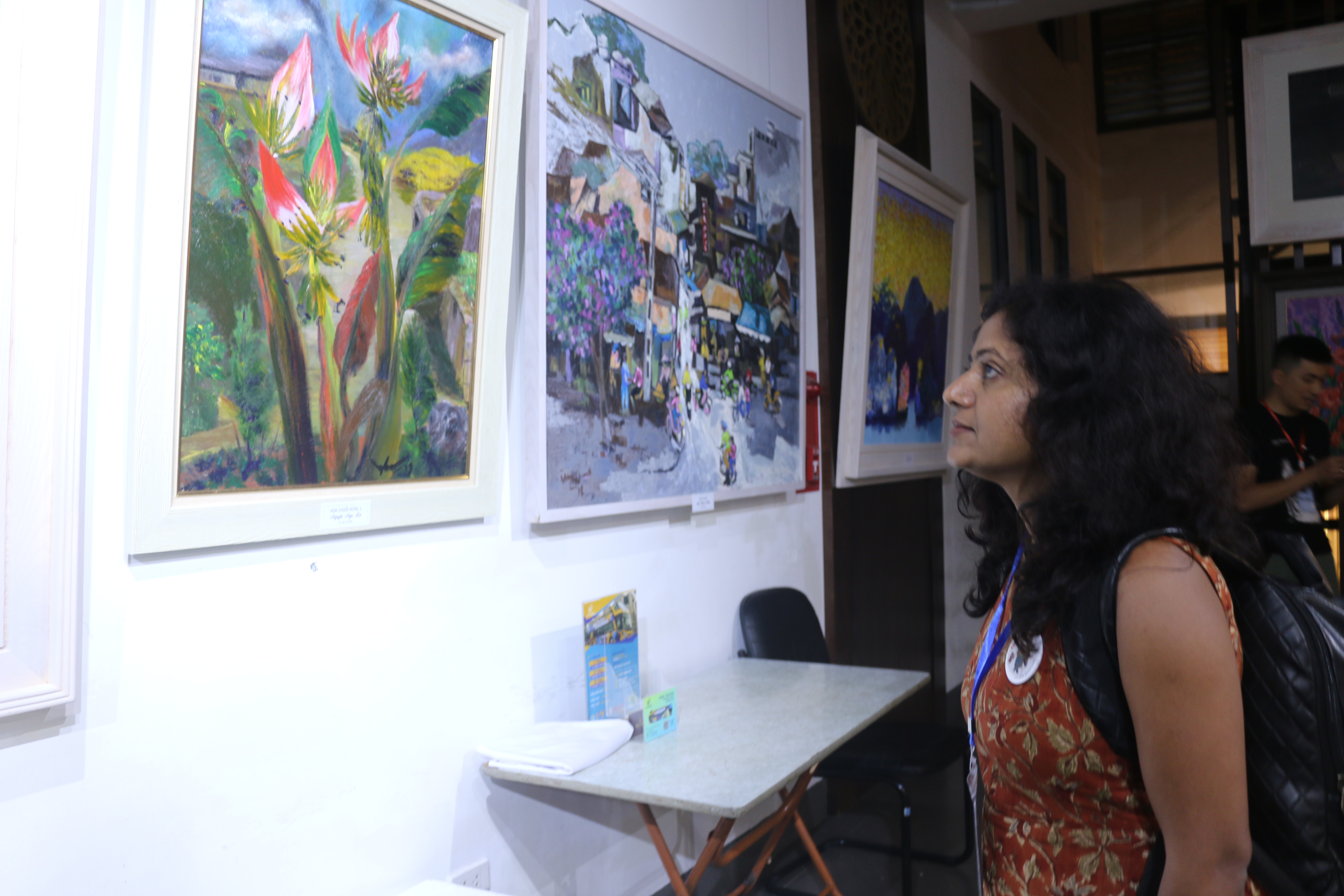 Tham dự triển lãm, chị Prajakja - họa sỹ đến từ Ấn Độ - cũng cho thấy sự quan tâm đến văn hóa và hội họa Việt Nam: "Có hai góc nhìn khi phân tích vào các bức tranh, một là của người họa sỹ, hai là của người xem triển lãm. Đối với tôi thì những bức tranh này thật sự rất đẹp. Như bức tranh về hoa sen, tôi đến từ Ấn Độ, cho nên tôi thấy rằng họa sỹ đã thể hiện rất rõ nét và sâu sắc hình ảnh của hoa sen. Những màu sắc rất sống động, giống như những bức vẽ tôi được thấy trên đường phố. Đó là những gì tôi cảm nhận".