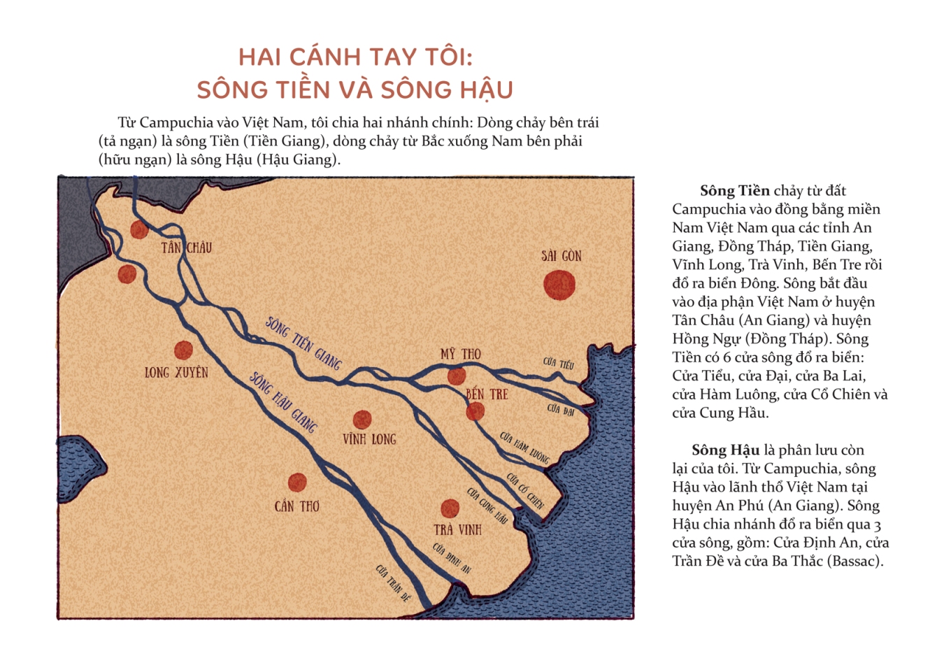 Với những bé đang ở độ tuổi bắt đầu tập đọc, mình nghĩ sách là lựa chọn phụ huynh có thể tham khảo. Con sẽ được dẫn dắt qua các hành trình: tìm về nguồn gốc bí hiểm của sông, lịch sử vùng sông xưa, con người hai bên bờ sông nước, sắc màu lễ hội,… Những trẻ lớn hơn, mình kỳ vọng các con sẽ say mê tìm về một trong những con sông nguồn cội, dòng sông lớn của đất Việt mến yêu.