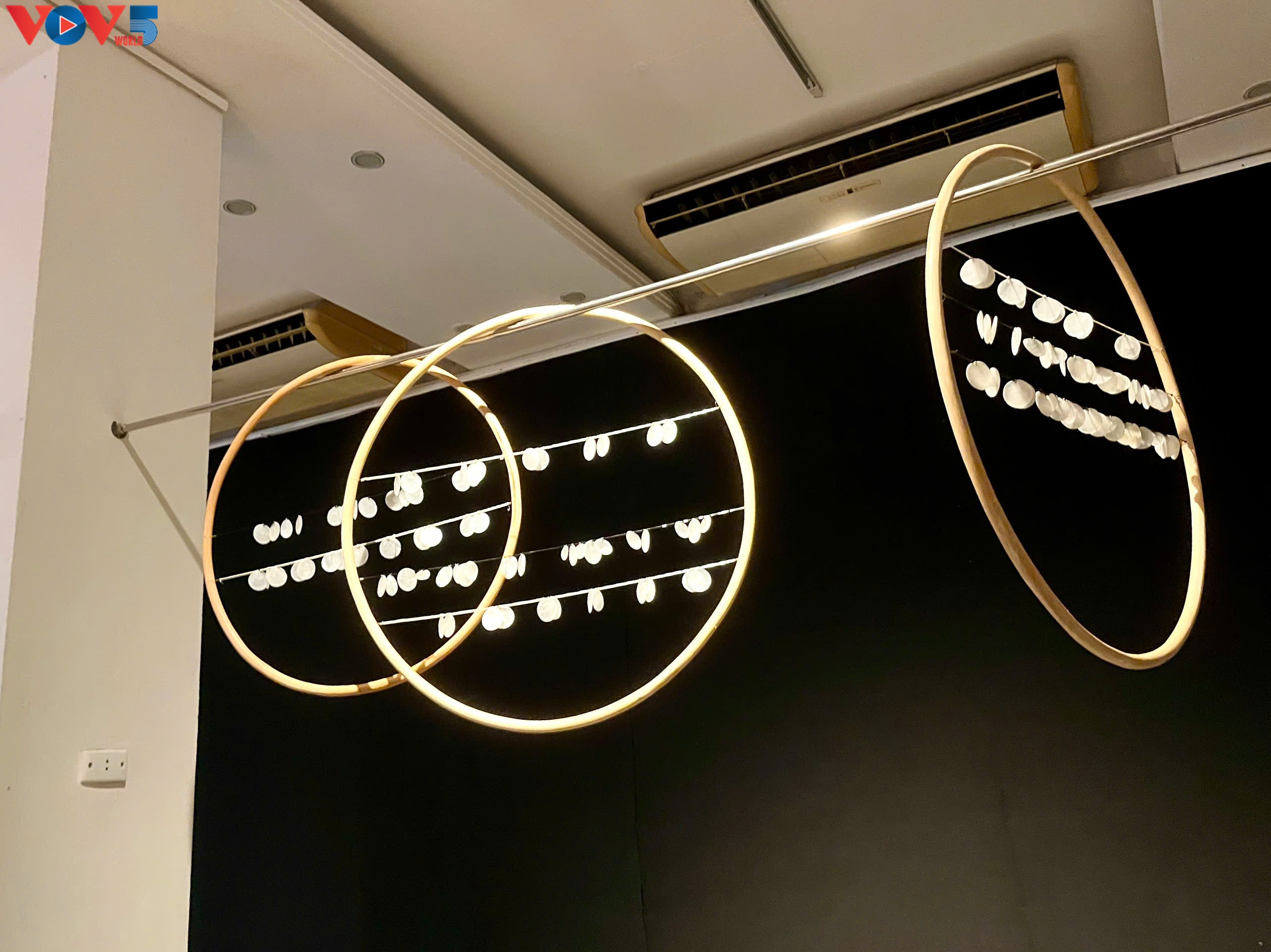 Thiết bị nghe (I – XII), 2025 được tạo ra bằng cách bện các cây mây lấy từ Thái Lan và Indonesia vào nhau thành hình vòng tròn, xung quanh treo các đồ vật để khi va chạm vào nhau tạo nên âm thanh. |