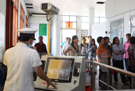 | Kiểm tra thân nhiệt khách nhập cảnh ở cửa khẩu. (Ảnh: TTXVN) |