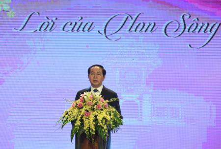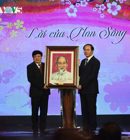 Phát biểu tại chương trình giao lưu nghệ thuật, Chủ tịch nước Trần Đại Quang nêu rõ, đất nước Việt Nam vừa tổ chức kỷ niệm trọng thể 70 năm Ngày Toàn quốc kháng chiến. Hôm nay, chúng ta xúc động kỷ niệm tròn 70 năm Chủ tịch Hồ Chí Minh đọc Thơ chúc Tết Đinh Hợi 1947 trên sóng Đài Tiếng nói Việt Nam động viên, khích lệ đồng bào, chiến sĩ cả nước. Chủ tịch nước khẳng định: “Lời thơ chúc Tết của Bác như là lời non nước, là tiếng hịch non sông".