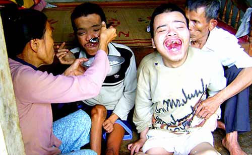 | Một gia đình có tới 3 thế hệ bị ảnh hưởng của chất độc da cam. Ảnh: sggp.org.vn |
