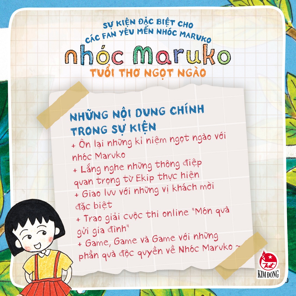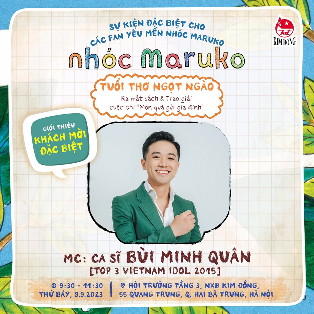 Nhân dịp bộ sách “Nhóc Maruko” chính thức ra mắt độc giả Việt Nam, Nhà xuất bản Kim Đồng tổ chức chương trình giao lưu Nhóc Maruko - Tuổi thơ ngọt ngào - và trao giải cuộc thi Món quà gửi gia đình. Chương trình diễn ra vào ngày 9/9/2023 tại trụ sở NXB Kim Đồng (55 Quang Trung, Q. Hai Bà Trưng, Hà Nội), với sự tham gia của Food Blogger Phan Anh Esheep, BTV Diệp Chi, MC ca sĩ Vietnam Idol Bùi Minh Quân.