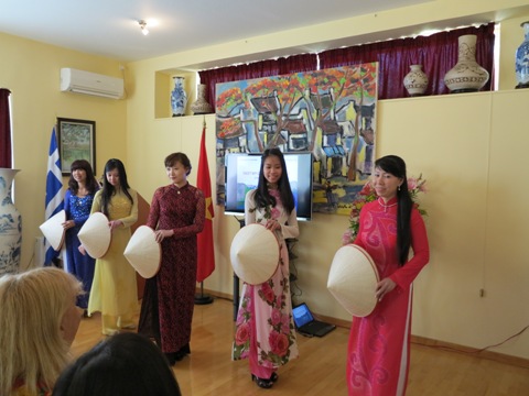 Phần giới thiệu áo dài Việt Nam diễn ra sôi động với tiết mục của các “người mẫu” là cán bộ nhân viên, phu nhân và con em của đại sứ quán và sự tham gia của đại diện cộng đồng người Việt ở Hy Lạp. Chị em đã tạo được ấn tượng lớn qua điệu múa nón tự biên tự diễn, thể hiện sự duyên dáng, thủy chung của người phụ nữ Việt trong tà áo dài thiết tha, uyển chuyển và e ấp với chiếc nón bài thơ xứ Việt. Tiết mục “ẩm thực truyền thống Việt” luôn là một phần được các bạn bè chờ đón. Sự hướng dẫn khéo léo và phần trình diễn khá thuần thục của các đầu bếp người Việt về các món nem rán, nem cuốn, chả, xôi... trong mùi thơm đặc biệt tỏa từ các nguyên liệu truyền thống tự nhiên của Việt Nam gây được những tiếng trầm trồ, thán phục từ các bà, các cô và các phóng viên.
