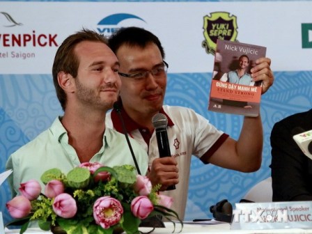 | Dịch giả Nick Vujicic (bên trái) giới thiệu cuốn sách mới của anh mang tựa đề “Đứng dậy mạnh mẽ” tại buổi giao lưu. (Ảnh: Thế Anh/TTXVN) |