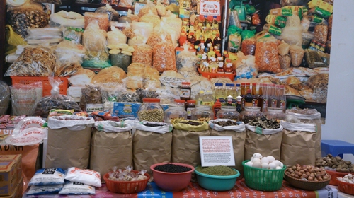 | Tái hiện quầy bán đồ khô trong chợ. |