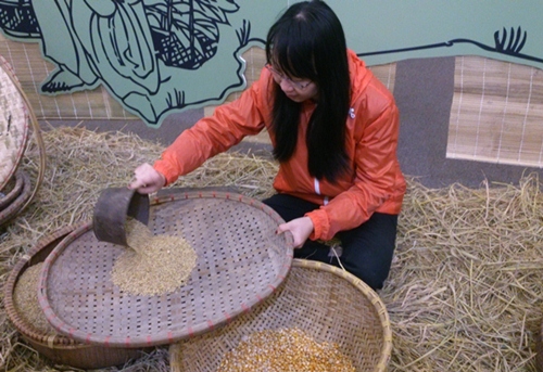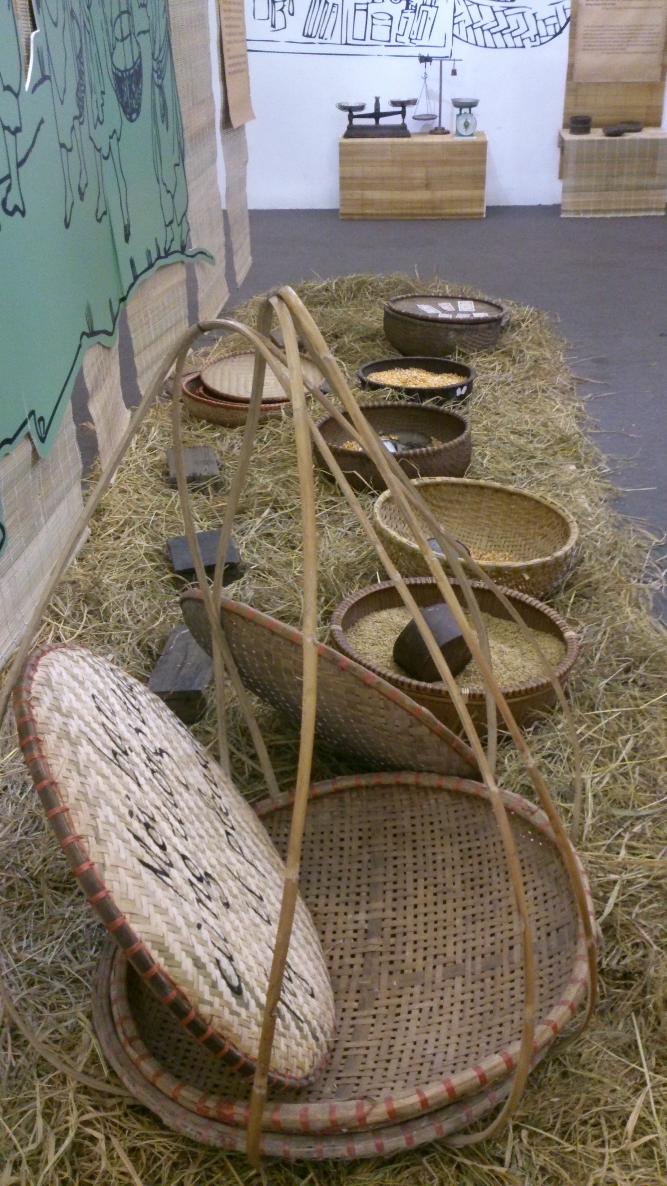Tiểu cảnh góc chợ xưa với những vật dụng quen thuộc như nong, nia, sàng, thúng, mẹt… bày trên lớp rơm rạ được bố trí ở chính giữa nhà trưng bày và cũng là điểm nhấn của triển lãm. Những khách tham quan lớn tuổi khi vừa bước vào đều đứng lặng hồi lâu trước không gian này. Với họ, những vật dụng này như gợi nhớ lại cảnh chợ xưa, khi còn là những cô bé, cậu bé theo mẹ ra chợ. Bà Nguyễn Kim Hạnh hồi tưởng:Chợ ngày xưa ấm cúng, mọi người đi chợ từ tốn, thong dong hơn. Có thể mua một vài món hàng, sau đó là đi ăn bánh đúc, bánh tẻ, ăn mía, ăn quà vặt rồi đến trưa là thong dong đi về, trên vai là là đòn gánh với cái quang, nhưng có những người không mang gì thì trên vai người ta lấy cái bị với cây mía làm đòn gánh.