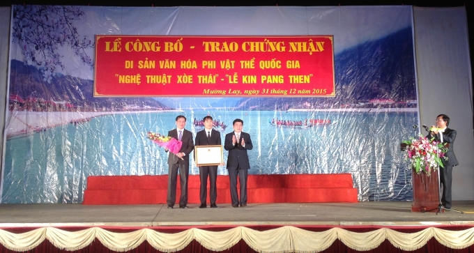 | Ông Lê Văn Quý, Phó Chủ tịch UBND tỉnh Điện Biên trao bằng và hai quyết định của Bộ Văn hoá Thể thao & Du lịch cho ông Lò Văn Mừng, Bí thư Thị uỷ thị xã Mường Lay |