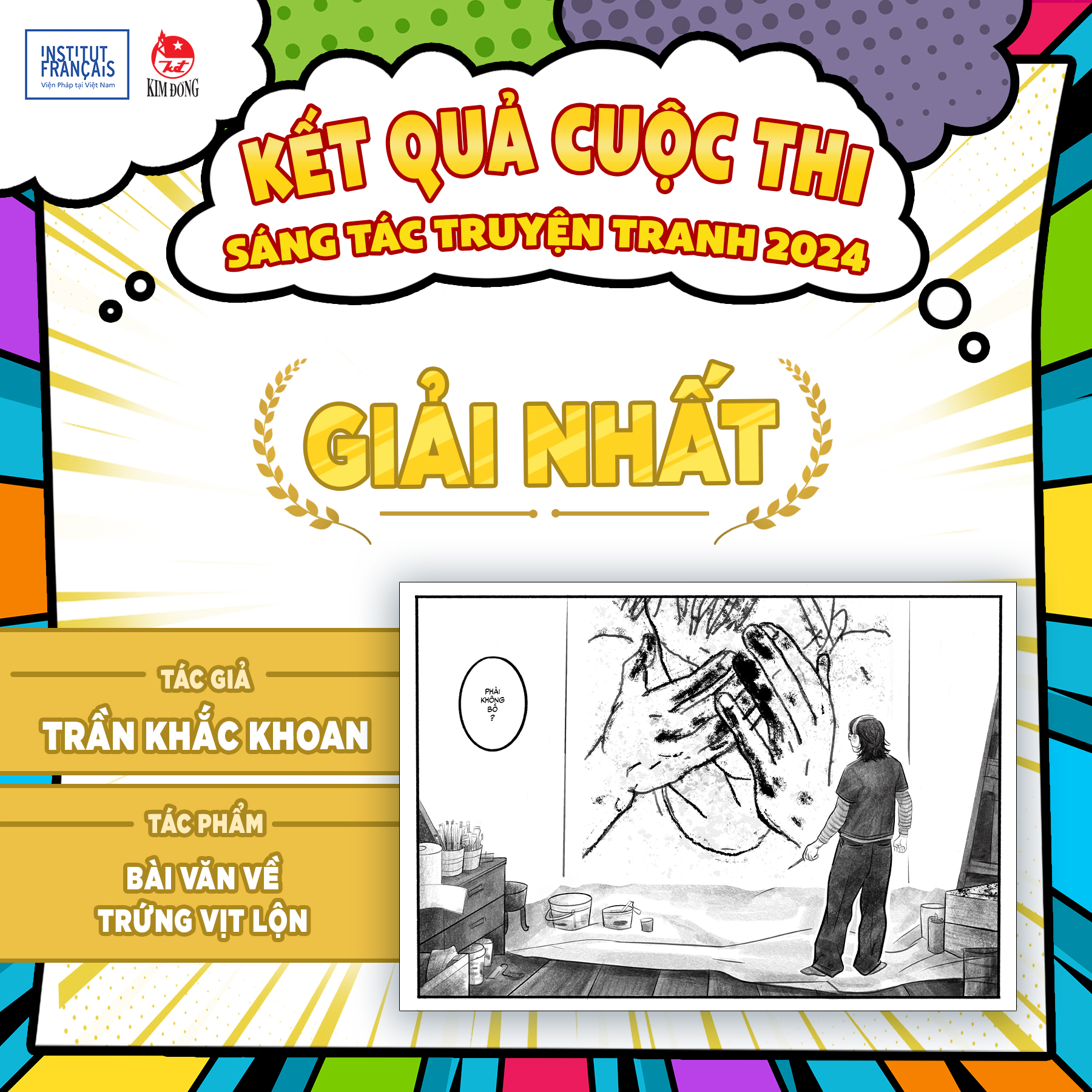Ban giám khảo gồm các họa sĩ uy tín của Pháp và Việt Nam như Clément Baloup, Maxime Péroz, Tạ Huy Long, Nguyễn Thành Phong. Giải nhất thuộc về tác giả Trần Khắc Khoan (sinh năm 1990, quê ở Lâm Đồng) với tác phẩm "Bài văn về trứng vịt lộn". Giải nhì thuộc về Cao Hoàng Anh Thư (sinh năm 1999, TPHCM) với tác phẩm "Bút chì đỏ". Giải ba thuộc về tác giả Trần Thảo Nguyên, hai giải khuyến khích thuộc về nhóm tác giả Ngô Thị Ngọc Anh - Vương Nhiên Khang, Nguyễn Hải Nam - Đỗ Đình Cương.