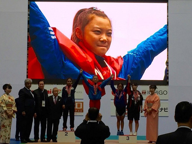 | Khổng Mỹ Phượng giành 3 huy chương vàng hạng 44 kg giải thanh thiếu niên châu Á năm 2016. - Ảnh: Báo Thanh niên |