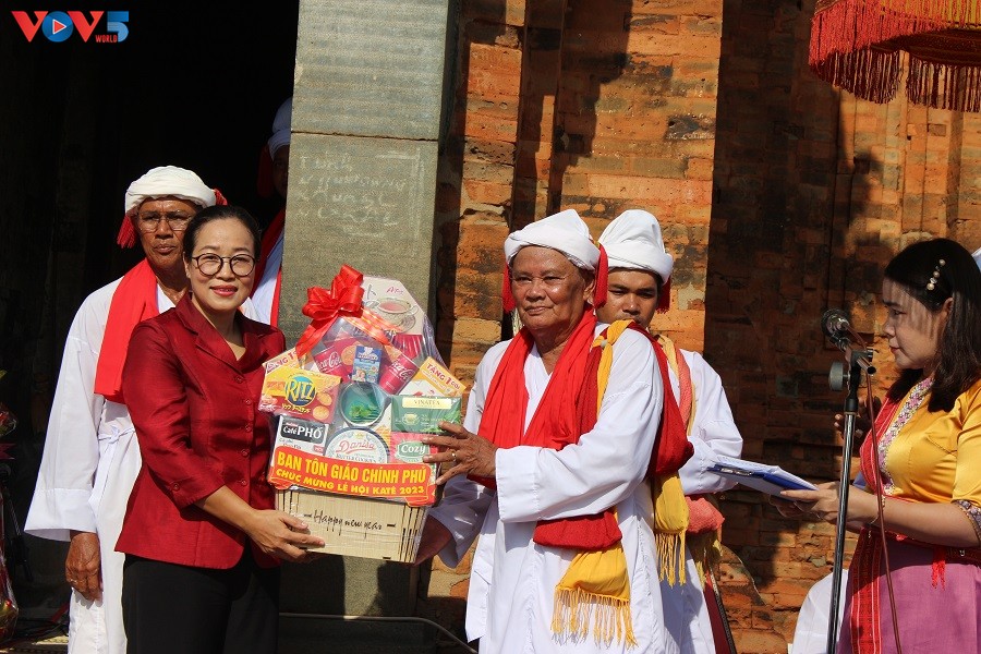 Đại diện Ban Tôn giáo Chính phủ tặng quà chúc mừng Lễ hội Katê năm 2023 tại tháp Pô Klong Garai ở Ninh Thuận - Ảnh: VOV |