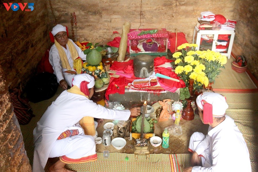 Chức sắc tôn giáo người Chăm thực hiện nghi lễ cúng thần linh trong tháp Pô Sah Inư ở Bình Thuận - Ảnh: VOV |
