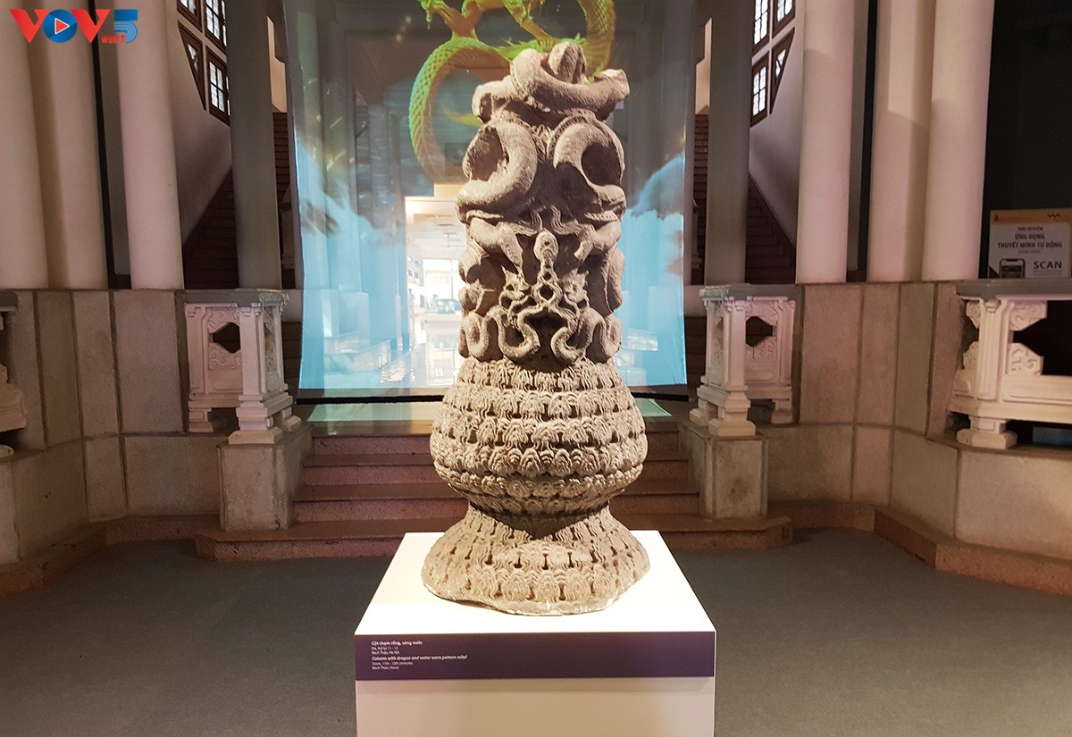 Tác phẩm cột chạm rồng, sóng nước bằng đá thế kỷ XI - XIII. Ảnh: Ngọc Anh/VOV5 |