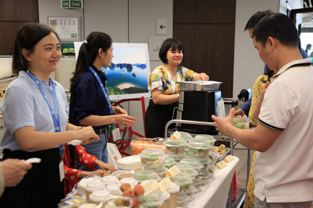 Đồng thời, gian hàng của Việt Nam giới thiệu phong tục và các sản phẩm truyền thống của đám ăn hỏi, đám cưới của Việt Nam như trầu cau, bánh phu thê, bánh cốm, hạt sen, trà, cà phê… Quầy ẩm thực của Phái đoàn Việt Nam giới thiệu các món ăn đậm đà hương vị Việt như nem, phở, vải Thanh Hà…