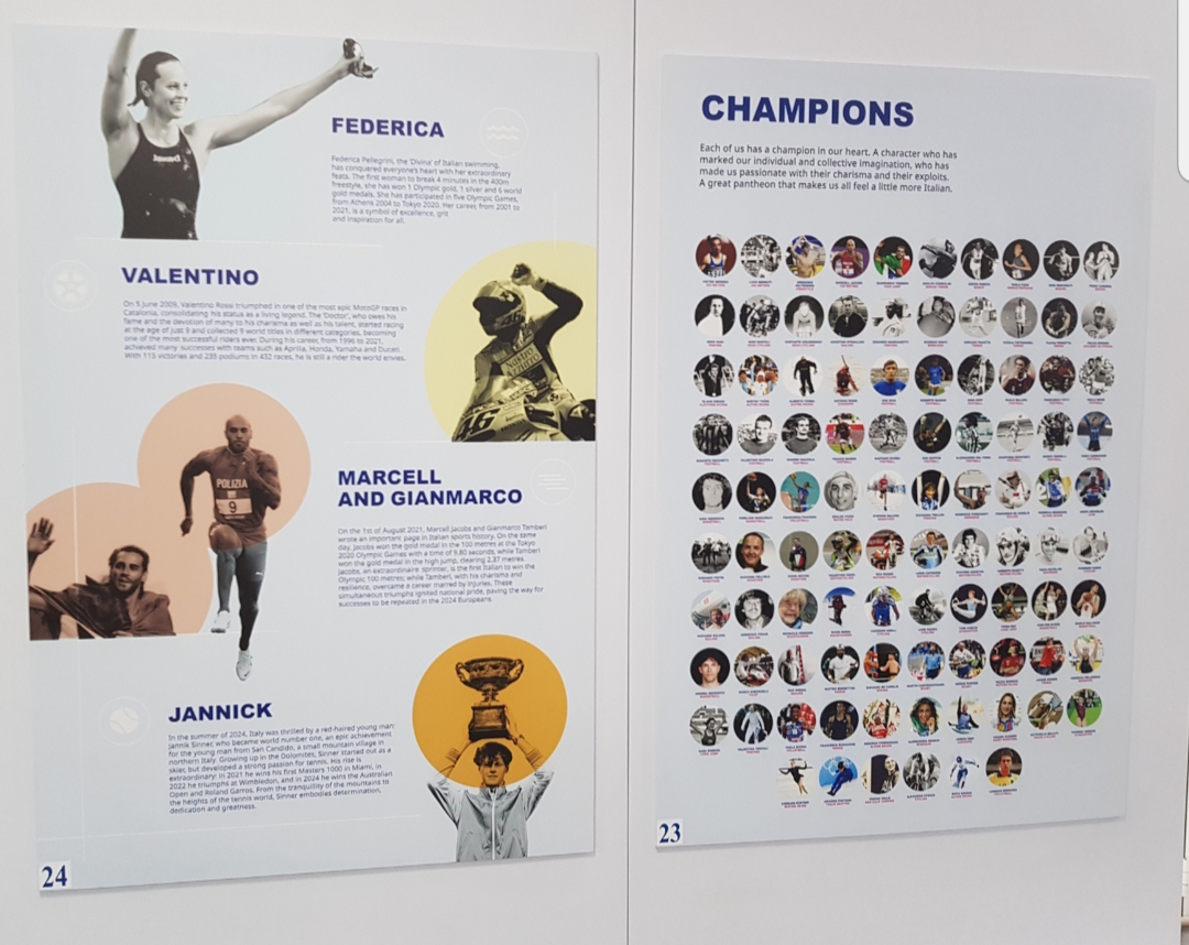 Với 24 tấm ảnh được thiết kế sáng tạo, Triển lãm đem đến những câu chuyện về những đổi thay của đất nước Italia trong suốt 1 thế kỷ thông qua thể thao. Triển lãm giới thiệu tới công chúng Việt Nam những địa điểm và vận động viên mang tính biểu tượng nhất của thể thao Italia.