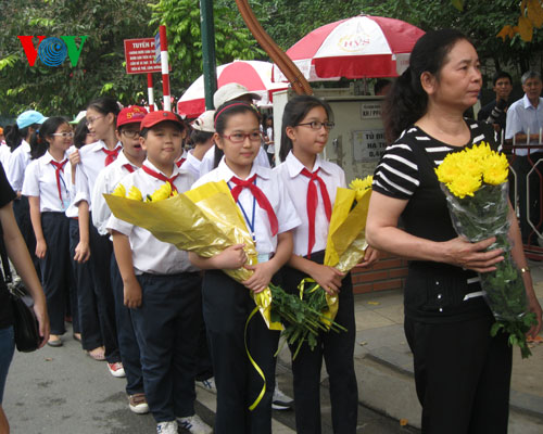 | Học sinh đeo khăn quàng đỏ, tay cầm những bông hoa trang trọng vào viếng Đại tướng |