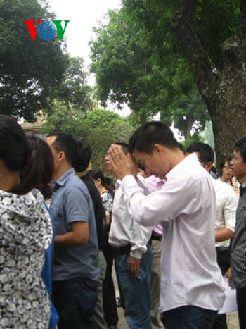 | Nhiều người không có điều kiện xếp hàng vào viếng, đành đứng trước cổng vái vọng vào khu nhà Đại tướng. |