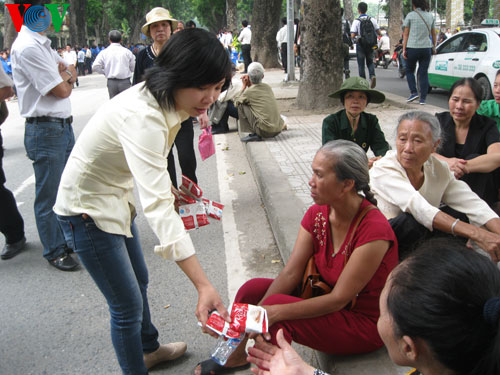 | Bánh và nước uống miễn phí được phát cho người dân đến viếng Đại tướng |