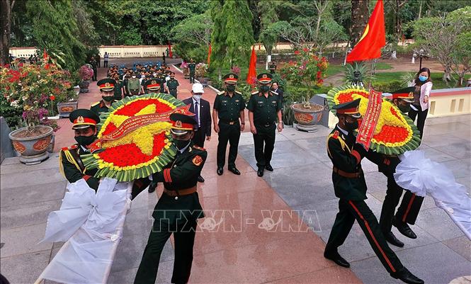 Các đại biểu tiến hành dâng hoa, tưởng niệm các anh hùng liệt sỹ tại Nghĩa trang Liệt sỹ huyện Đăk Tô (Kon Tum). Ảnh: TTXVN |