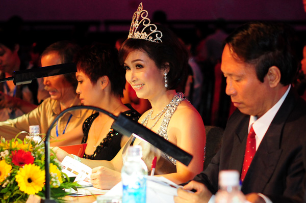 | Ban giám khảo của cuộc thi, Hoa hậu đầu tiên của Việt Nam Bích Phương chấm điểm các thí sinh. |