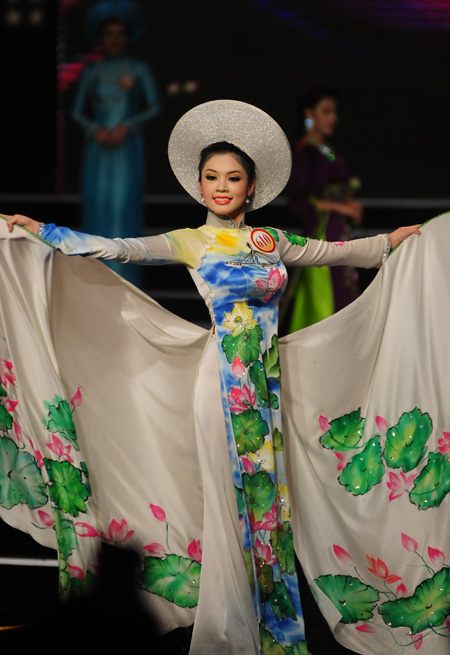 | Hoa hậu Đặng Thu Thảo trong phần thi trang phục áo dài. |