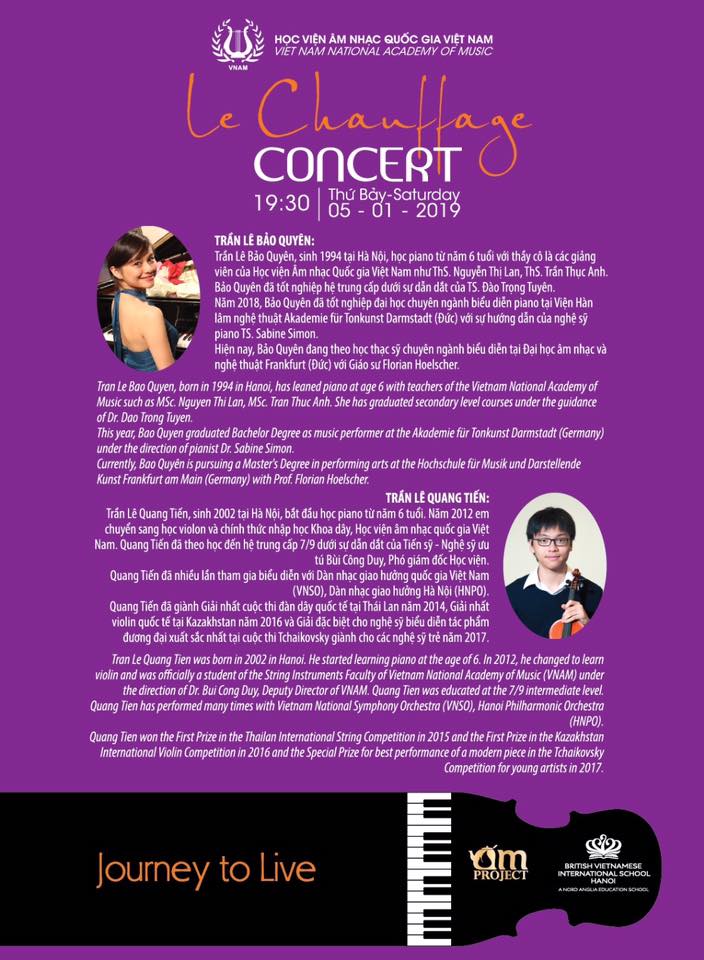 Đêm nhạc sẽ diễn ra vào 19h30, thứ 7, ngày 5/1/2019 tại Phòng hòa nhạc, Học viện Âm nhạc Quốc gia Việt Nam, 77 Hào Nam , Hà Nội.
