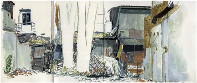Tác phẩm “Sài Gòn, cây xanh và đổ nát” của nghệ sĩ Freddy Nadolny Poustochkine với chất liệu bột màu trên giấy - Ảnh: baotintuc.vn |