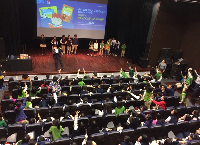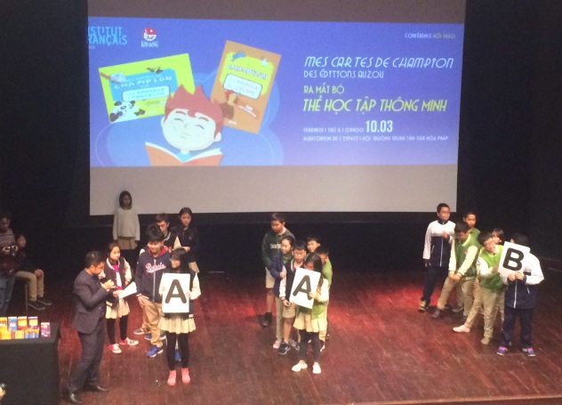| Các em nhỏ đang hào hứng chơi trò chơi mà người dẫn chương trình đưa ra trong buổi ra mắt bộ Thẻ học tập thông minh do NXB Kim Đồng ấn hành từ bản quyền của Pháp |
