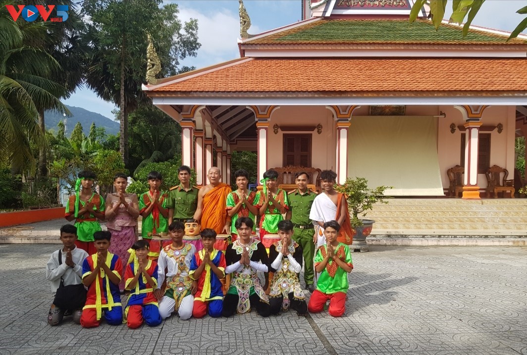 Đội múa trống Chhay-dăm của chùa Snaydonkum chụp ảnh cùng hoà thượng Chau Sơn Hy và lực lượng an ninh. Ảnh: Ngọc Anh/VOV5