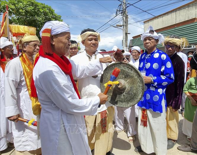 Các vị chức sắc đồng bào Chăm đánh chiêng, bắt đầu nghi thức đi rước y trang tại Lễ hội Katê 2022. Ảnh: TTXVN |