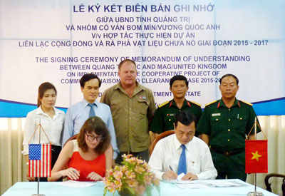 Ngày 18/05, Ủy ban nhân dân tỉnh Quảng Trị và Tổ chức Nhóm Cố vấn bom mìn (MAG) ký kết biên bản ghi nhớ hợp tác thực hiện dự án “Liên lạc cộng đồng và rà phá vật liệu chưa nổ tỉnh Quảng Trị, giai đoạn 2015-2017”. Dự án do Bộ ngoại giao Hoa Kỳ tài trợ nhằm làm giảm nguy cơ thương vong do bom, mìn, các loại vật liệu chưa nổ và hỗ trợ phát triển kinh tế xã hội cho cộng đồng dân cư chịu ảnh hưởng của chiến tranh ở tỉnh Quảng Trị. Bên cạnh đó, tiến hành rà soát các khu đất phục vụ mục đích phát triển cộng đồng và xử lý tất cả các loại bom, mìn và các loại vật liệu chưa nổ tại các địa phương.
