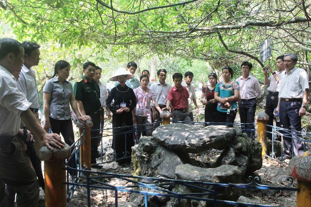 Du khách tham quan bàn đá - nơi Bác ngồi làm việc trong những ngày ở Pác Bó - Ảnh: Báo Cao Bằng điện tử |
