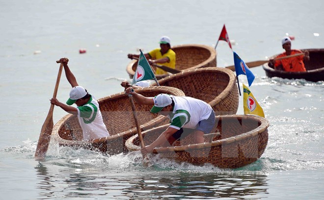 Hội thi bơi thúng, lắc thúng trong khuôn khổ Festival Biển Nha Trang. (Ảnh: Thanh Hà/TTXVN)