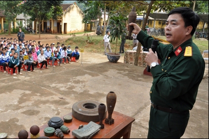 Tại đây, Thượng tá Nguyễn Hồng Sơn, Trưởng phòng Kỹ thuật an toàn, thuộc Trung tâm Công nghệ xử lý bom mìn, Bộ Tư lệnh Công Binh, đang hướng dẫn cho giáo viên và học sinh cách nhận biết một số loại mìn, vật nổ thường gặp và cách xử lý khi phát hiện các vật nghi là bom, mìn, vật nổ. Lớp học diễn ra sôi nổi bởi giáo viên, học sinh và người dân không những nắm được thông tin cụ thể về sự nguy hiểm và tính sát thương, mà còn được trực tiếp quan sát và cách nhận biết thông qua một số hiện vật một số loại mìn, vật nổ thường gặp ở khu vực vùng biên. Em Hoàng Văn Cảnh, học sinh lớp 9B, cho biết qua các phương tiện truyền thông, nhất là Đài Tiếng nói Việt Nam, và ở địa phương có người đã bị thương do mìn, giúp em phần nào biết về độ nguy hiểm của bom, mìn, vật nổ. Em tâm sự: "Qua buổi học, cháu nhận thức được sự nguy hiểm của bom mìn, những tính năng, tác dụng của bom mìn làm hại đến con người. Cháu cũng đã biết cách xử trí khi gặp bom mìn lúc đi rừng, đi làm cùng bố mẹ. Khi phát hiện, cháu sẽ đánh dấu lại và báo cho người lớn hoặc các chú bộ đội. Cháu về sẽ kể cho bố mẹ và người thân trong gia đình và mọi người trong bản để mọi người cùng phòng tránh bom mìn”.