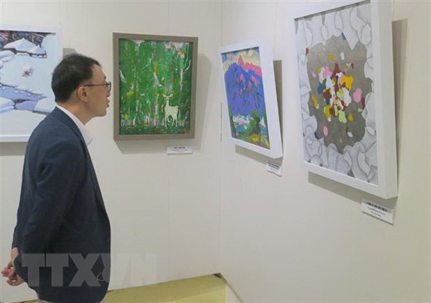 Du khách Hàn Quốc xem tranh trưng bày tại triển lãm. Ảnh: TTXVN |