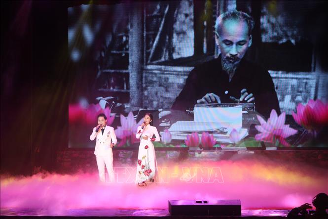 Song ca "Lời Bác sáng mãi muôn đời" do nghệ sĩ Trung tâm Nghệ thuật truyền thống Nghệ An biểu diễn. Ảnh: TTXVN |